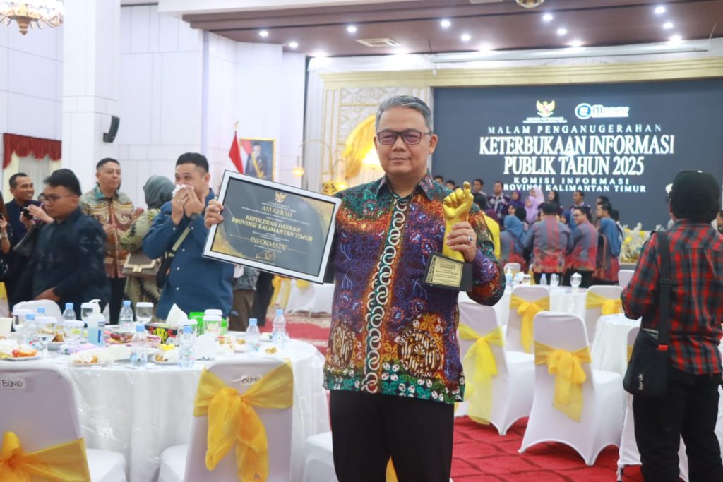 Tribratanews.polri.kaltim.go.id, Samarinda – Kepolisian Daerah Kalimantan Timur melalui Bidang Hubungan Masyarakat Polda Kaltim berhasil meraih anugerah sebagai Badan Publik Informatif pada kategori Instansi Vertikal Se-Provinsi Kalimantan Timur. Penghargaan ini diberikan dalam ajang Penganugerahan Keterbukaan Informasi Badan Publik Kaltim Tahun 2025 yang digelar oleh Komisi Informasi Provinsi Kalimantan Timur di Gedung Pendopo Odah Etam, Kawasan Perkantoran Gubernur Kaltim, Kota Samarinda, Jumat malam (03/10/25).