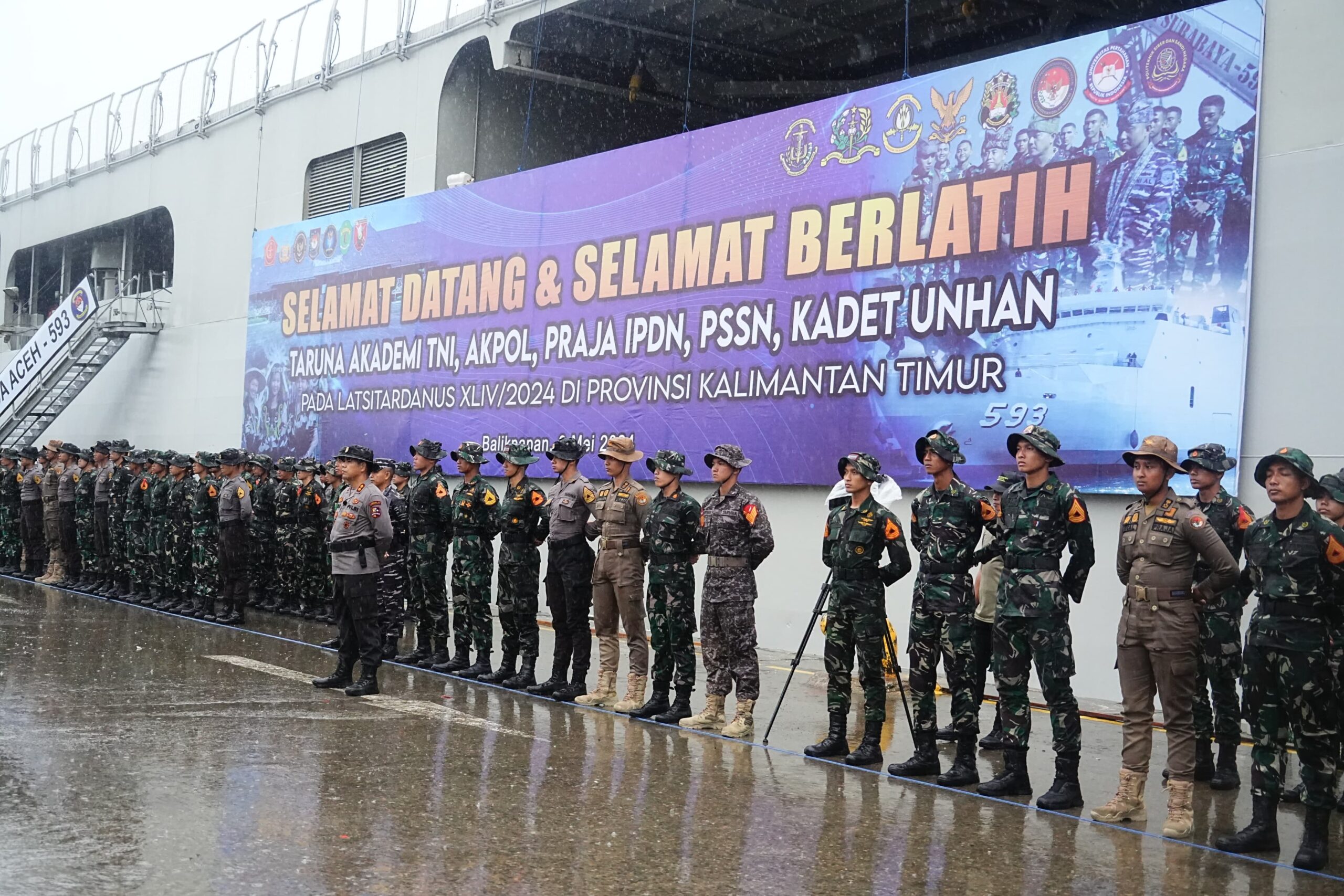 Tribratanews.kaltim.polri.go.id, Balikpapan – Guyuran hujan mengiringi pelaksanaan upacara penyambutan kedatangan Latsitardanus XLIV /2024 bertempat di Pelabuhan Semayang Balikpapan, Jumat (3/5/2024).