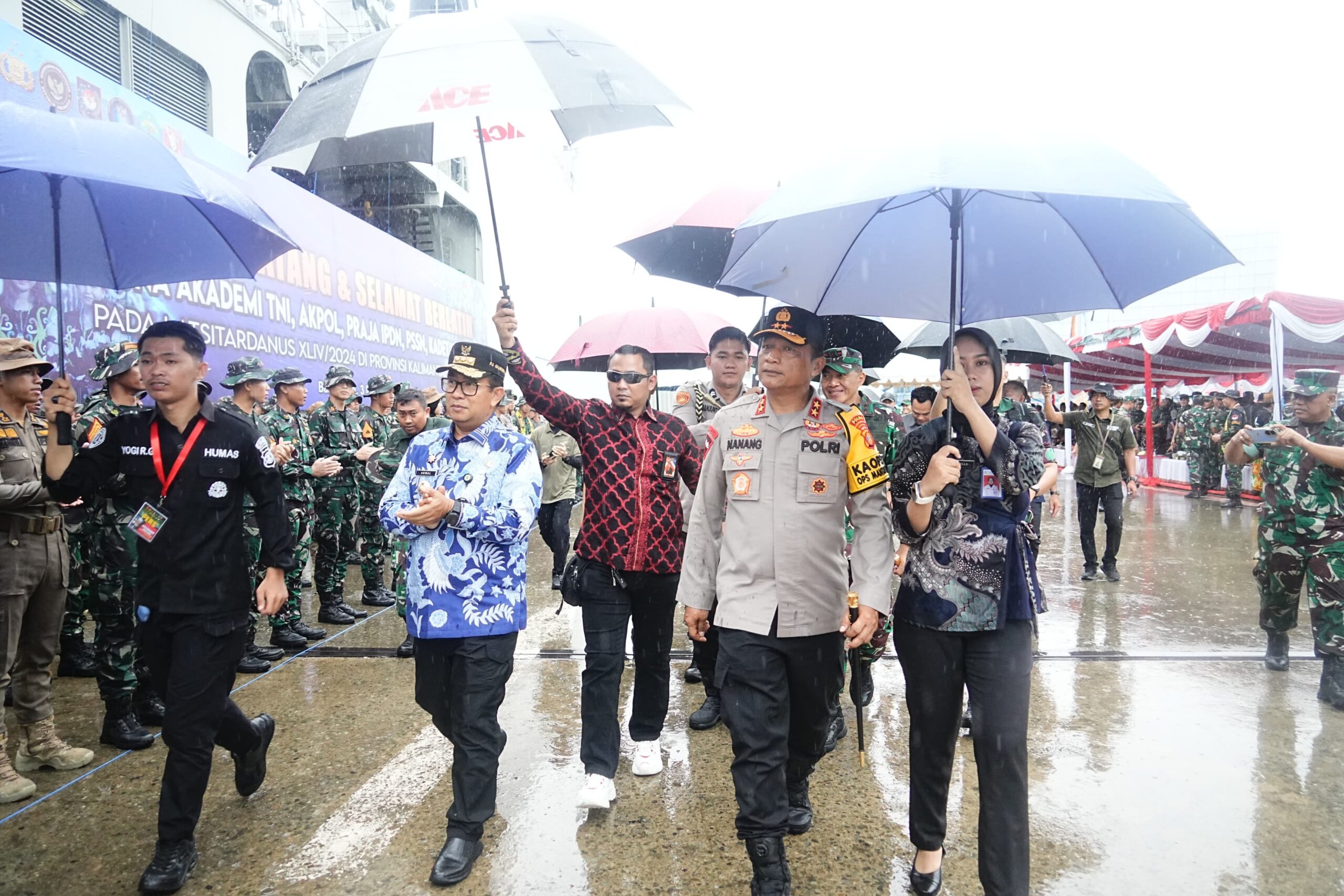 Pj. Gubernur Kaltim Dr. Drs. Akmal Malik, M.Si, Kapolda Kaltim Irjen. Pol. Drs. Nanang Avianto, M.Si., Pangdam VI Mulawarman Mayjen TNI Tri Budi Utomo menyambut kedatangan 1850 peserta Latsitardanus XLIV /2024 yang menggunakan tiga kapal armada (Kapal Perang RI Banda Aceh, KRI Banjar Masin, KRI Teluk Makasar).
